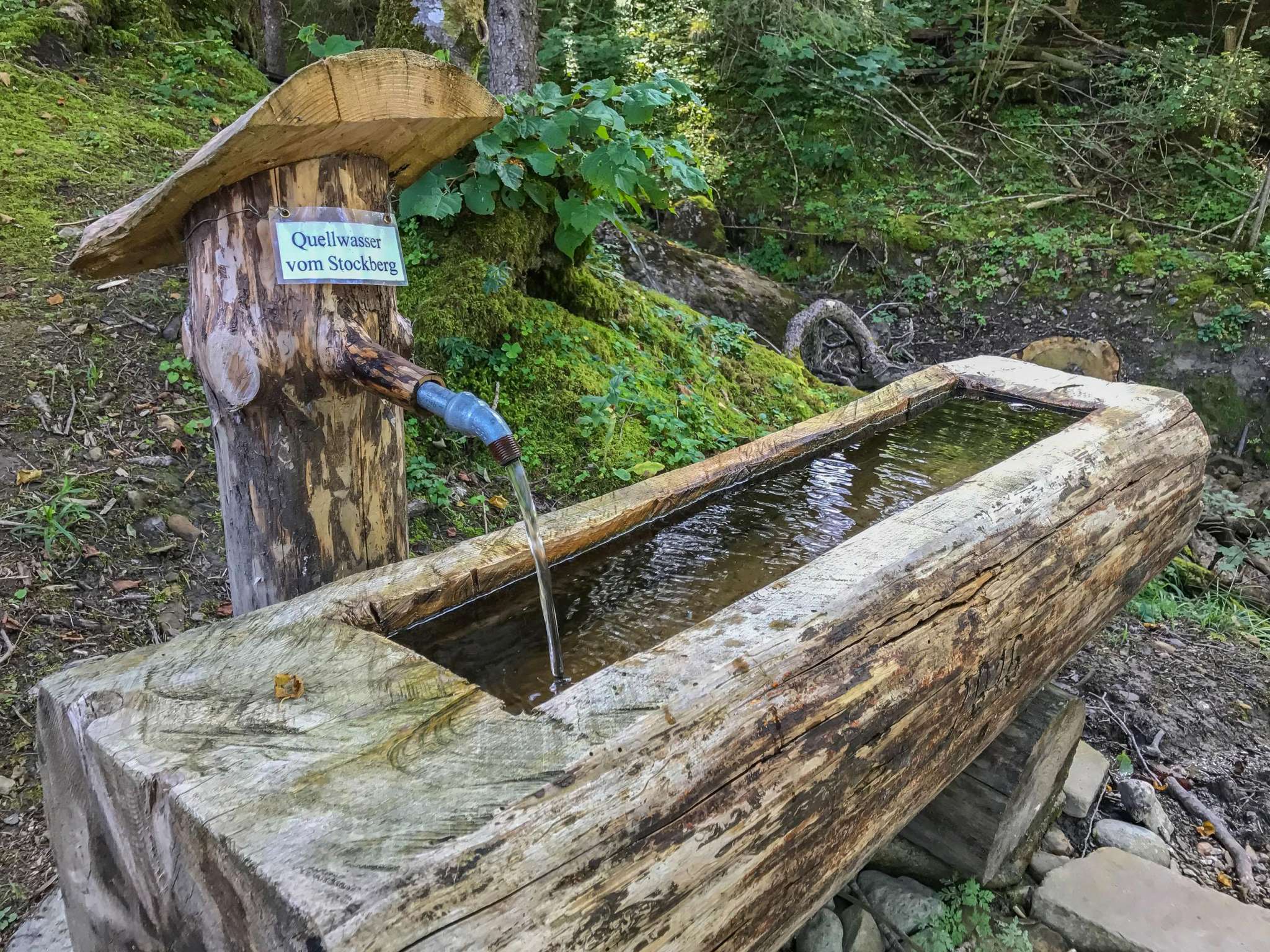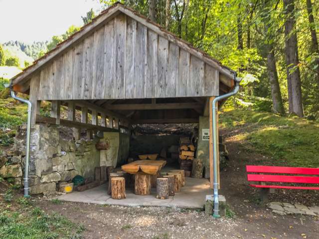 Der Grillplatz liegt zwischen der ehemaligen Skipiste und einem Bach. Unter dem grosszügigen Dach findet man zwei Tische, einen für die Erwachsenen und einen kleineren für die Kinder. Beide Tische sind umgeben von Holztremel, welche als Hocker dienen. Auch hier hat man wieder an die Kinder gedacht und am kleinen Tisch auch kleine Tremel hingestellt. Zusätzlich gibt es noch zwei Ruhebänke direkt am Grillplatz und eine weitere auf der anderen Bachseite. Die Feuerstelle ist von Steinen umgeben und verfügt über einen Rost, der gut in der Höhe verstellt werden kann. Der Rost wird bei Nichtgebrauch unter dem Dach verräumt. Im Unterstand findet man einen grossen Holzvorrat und auch etwas Zeitungspapier. Wem das Schwefelwasser nicht schmeckt, der hat Glück: Direkt am Grillplatz findet man nämlich auch einen Brunnen mit Quellwasser vom Stockberg! Das Schwefelwasser plätschert in einen Brunnen etwas weiter unten. Besucher des Grillplatzes können sich in einem Gästebuch eintragen und auch ein Fotoalbum anschauen, in welchem man Bilder der Bauarbeiten betrachten kann. Kinderwagentauglich: nein, Holz: ja, Trinkwasser: ja, WC: nein, Kapazität: ca. 8