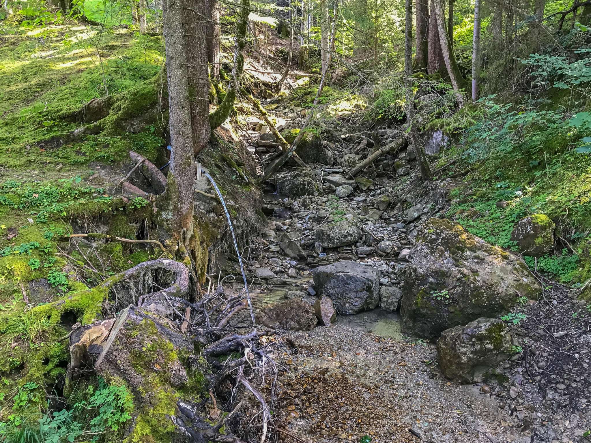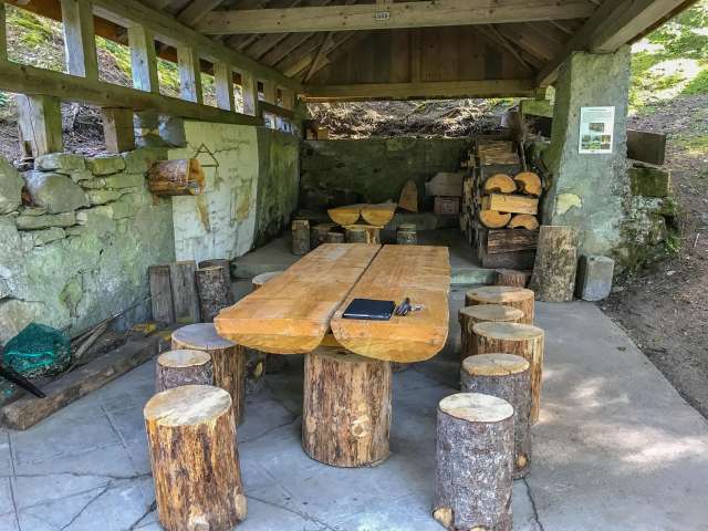 Schöner Grillplatz im Wald mit überdachten Tischen, Holzvorrat und Trinkwasserbrunnen.