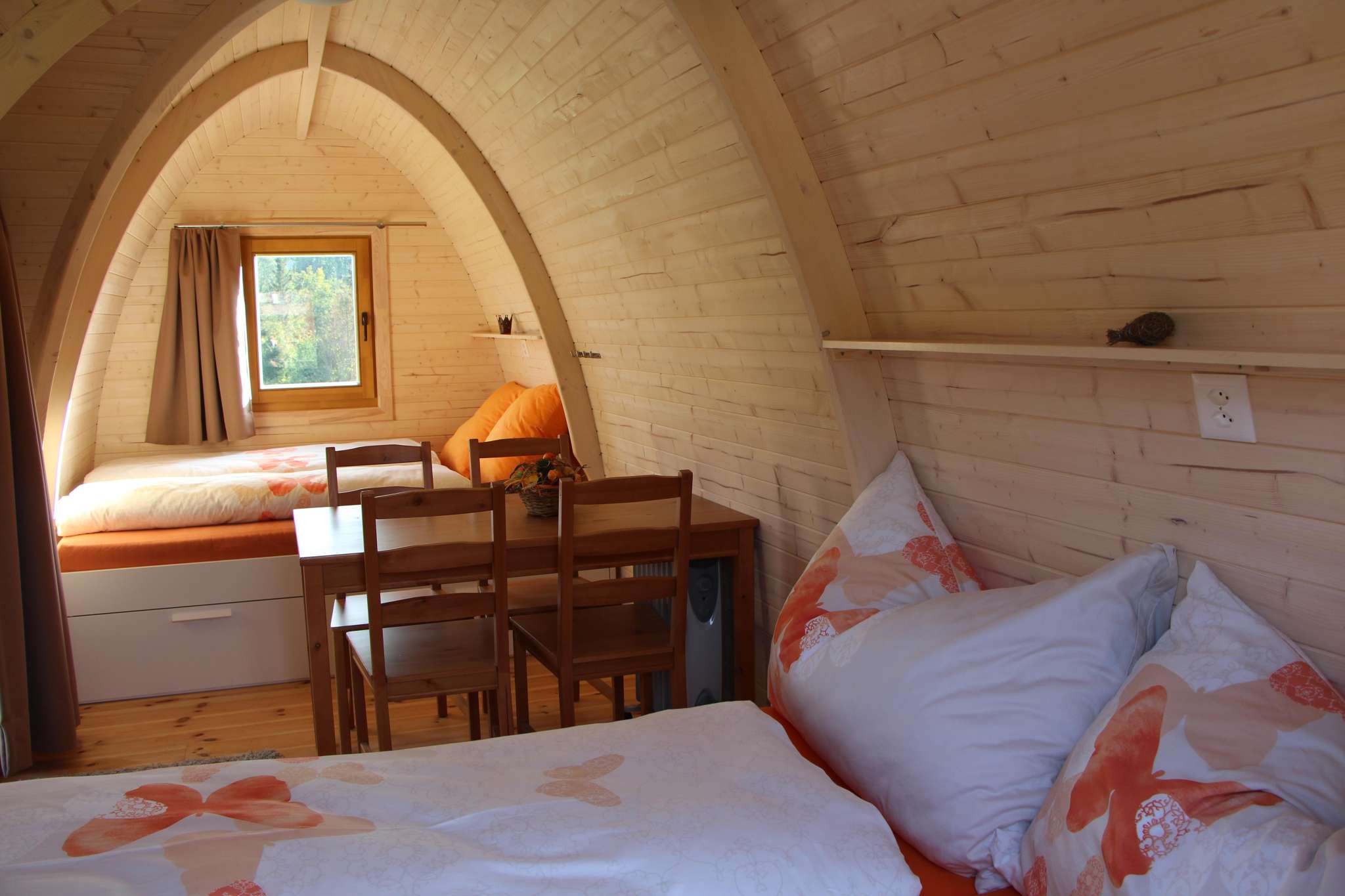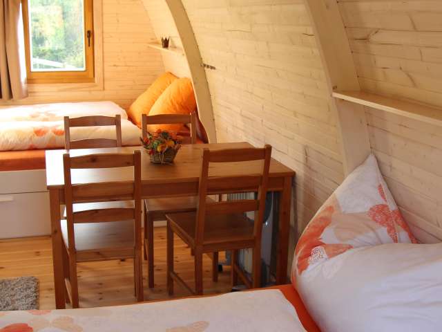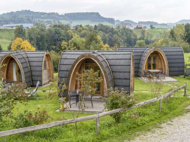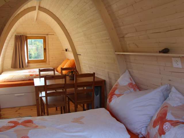 Unsere Podhouses sind heimelige Holziglus und bieten Platz für 2 bis 4 Personen. Sie haben Ihr Schlafzimmer mit bequemen Betten in der freien Natur, wo Sie morgens höchstens von Vogelgezwitscher geweckt werden. Auf Komfort müssen Sie nicht verzichten, wir bieten Ihnen auch einen gemütlichen Aufenthaltsraum mit Kiosk und Kochgelegenheit. Zudem verwöhnen wir Sie am Morgen mit einem reichhaltigen Frühstück mit vielen hofeigenen Bioprodukten.